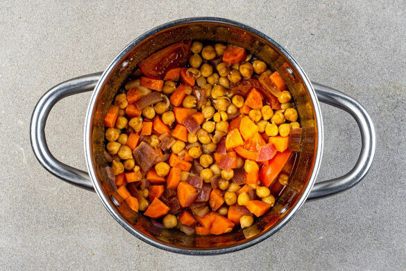 Die Zwiebeln und die Karotten in einem großen Topf mit 2EL Pflanzenöl und 1TL Salz bei mittlerer Hitze ca. 6Min. anbraten. Die Currypaste zugeben und ca. 1Min. mitbraten, dann die Tomaten, die Kichererbsen und 300ml Wasser hinzufügen. Abgedeckt ca. 10Min. köcheln lassen.