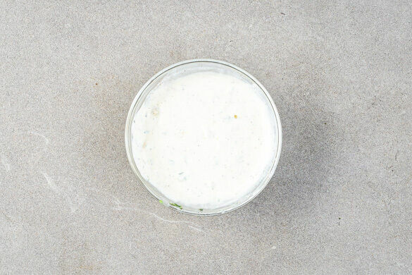 Die Crème fraîche mit der ½ des Knoblauchs, der ½ des Zitronensafts und dem Thymian verrühren. Die Creme mit Pfeffer abschmecken.