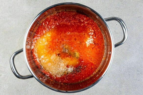 Den Reis in einem Sieb kalt abspülen, bis das Wasser klar bleibt. Die Zwiebeln schälen und vierteln. Den Knoblauch schälen. Die Tomaten vierteln. Die Zwiebeln, den Knoblauch, die Tomaten und das Tomatenmark in einem hohen Gefäß mit einem Stabmixer glatt pürieren. Die Oliven grob schneiden.