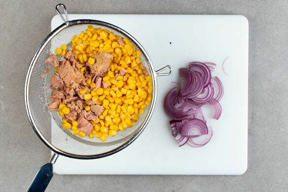 Den veganen Thunfisch in ein Sieb abgießen und abtropfen lassen. Die ½ des Maises dazugeben und ebenfalls abtropfen lassen. Die Zwiebel schälen, halbieren und in feine Streifen schneiden.