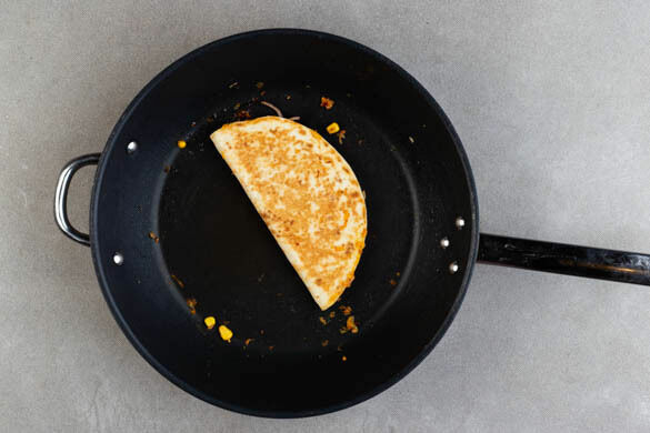 1 Tortilla in eine große Pfanne geben und 2–3EL Thunfischfüllung auf einer Seite der Tortilla verteilen, die andere Seite darüber falten. Den Vorgang mit einer weiteren Tortilla wiederholen und beide Quesadillas gleichzeitig bei niedriger bis mittlerer Hitze 4–6Min. von jeder Seite braten, bis sie goldbraun sind und der Käse geschmolzen ist.