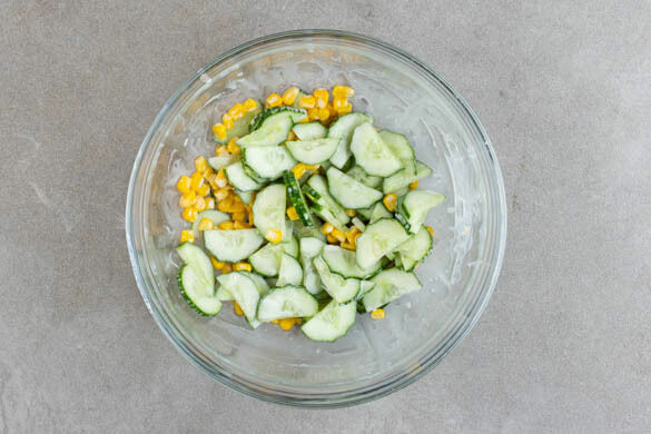 Inzwischen die Gurke längs halbieren und quer in ca. 0,5cm dünne Scheiben schneiden. Den übrigen Mais abtropfen lassen. 1TL Mayonnaise mit ½TL Essig verrühren, dann mit den Gurken und dem Mais vermengen.
