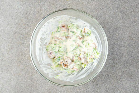 Das Fleisch mit ⅔ der Crème fraîche und 160ml Wasser zurück in die Pfanne geben und alles bei mittlerer bis niedriger Hitze ca. 8Min. köcheln lassen, bis das Fleisch gar und das Gemüse weich ist.