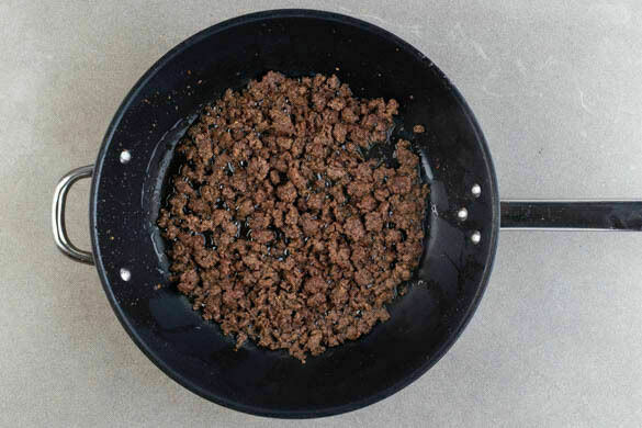 Das Hackfleisch in einer großen Pfanne mit 2EL Pflanzenöl bei starker Hitze 2–4Min. krümelig anbraten.