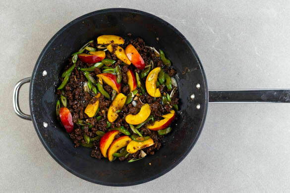 Den Sellerie und den Knoblauch dazugeben und 2–3Min. bei mittlerer Hitze mitbraten. Mit der Teriyakisauce ablöschen und die Nektarinenscheiben sowie die 1/2 der Lauchzwiebeln untermengen. Mit Salz und Pfeffer abschmecken.