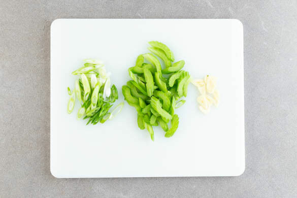 Die Lauchzwiebeln schräg in sehr feine Ringe schneiden. Den Sellerie in ca. 1cm breite Stücke schneiden. Den Knoblauch schälen und in feine Scheibchen schneiden.