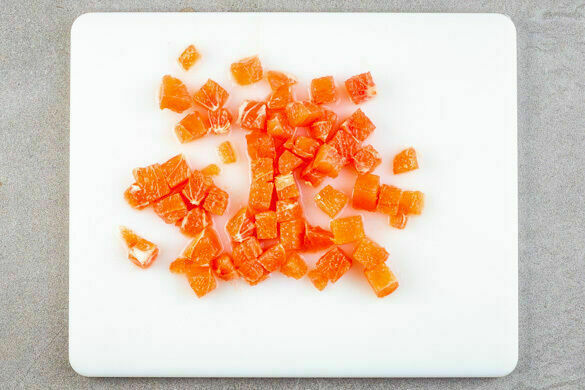 Die Grapefruits mit einem Messer schälen, dabei auch die weiße Haut entfernen. Das Fruchtfleisch in Würfel schneiden, den Saft auffangen.