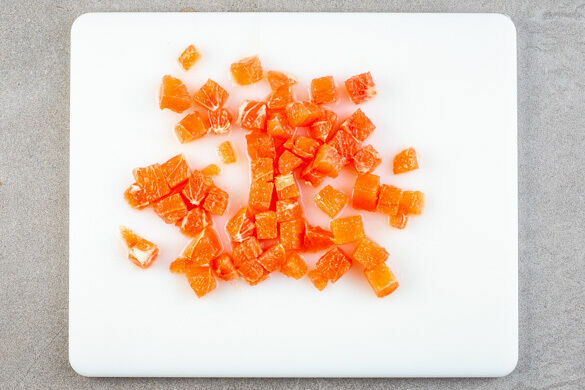 Die Grapefruit mit einem Messer schälen, dabei auch die weiße Haut entfernen. Das Fruchtfleisch in Würfel schneiden, den Saft auffangen.