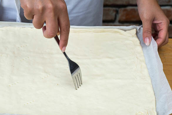 Mit einer Gabel Löcher in die Teige stechen und die Teige 3–4Min. im Ofen vorbacken, bis er leicht zu bräunen beginnt.
