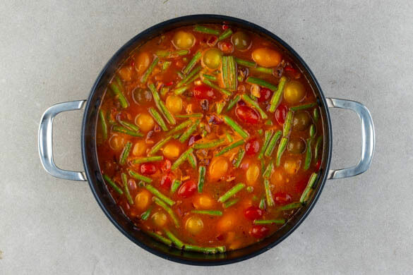 Die Hitze reduzieren und die Pasta und das Gemüse unter gelegentlichem Rühren 10–15Min. köcheln lassen, bis die Flüssigkeit größtenteils aufgesogen und die Pasta bissfest ist. Mit Salz und Pfeffer abschmecken.