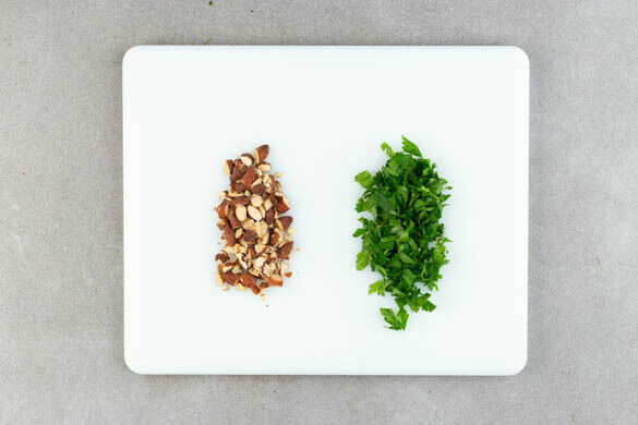 Die Rauchmandeln grob hacken. Die Petersilie grob schneiden. Den Fisch auf dem Risoni-Gemüse anrichten und mit den Mandeln und der Petersilie garniert servieren.