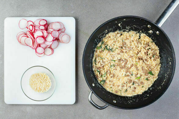Die Radieschen in dünne Scheiben schneiden oder hobeln. Den Käse fein reiben. Die 1/2 des Käses mit dem Trüffelöl vermengen. Die Basilikumblätter abzupfen und fein schneiden. Das fertige Risotto vom Herd nehmen, den Käse-Trüffelöl-Mix und das Basilikum untermengen und das Risotto mit Salz und Pfeffer abschmecken.