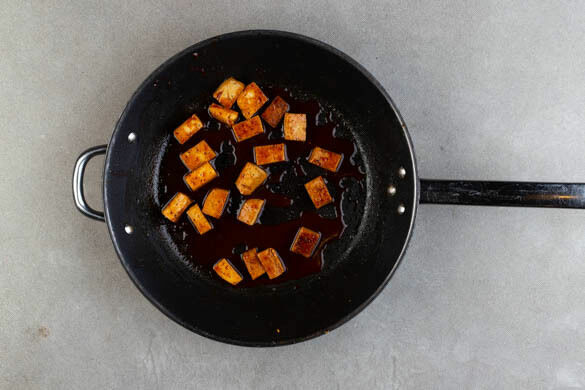 Die restliche Chilipaste und die Sojasauce in derselben Pfanne mit 2TL Honig, 2TL Essig und 125ml Wasser verrühren und bei mittlerer Hitze 2–3Min. einköcheln lassen. Den Tofu zurück in die Pfanne geben und mit der Sauce vermengen.
