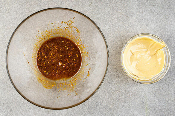 Den Grill anfeuern oder den Backofen auf 220°C (200°C Umluft) vorheizen. 8 Schaschlikspieße in warmem Wasser einweichen. Die Fenchelsamen mit 2EL Olivenöl, 2EL Balsamicoessig und 2TL Senf zu einem Dressing verrühren. 4EL Mayonnaise mit 2TL Senf, 1TL Balsamicoessig und 1TL Wasser zu einem Dip verrühren.