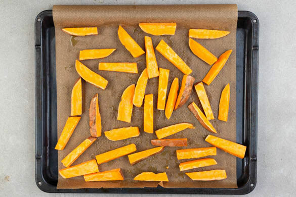 Den Backofen auf 240ºC (220ºC Umluft) vorheizen. Die Süßkartoffeln samt Schale in ca. 2cm dicke Stifte schneiden und auf einem mit Backpapier ausgelegten Backblech mit 3EL Olivenöl und 1TL Salz vermengen. Im Ofen 15–20Min. backen, bis die Süßkartoffeln leicht gebräunt und gar sind.