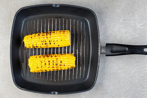 Eine Grillpfanne ohne Zugabe von Fett hoch erhitzen. Die Maiskolben in die heiße Pfanne legen, mit je 1 Prise Salz und Pfeffer würzen und ca. 5Min. grillen, bis der Mais stellenweise gebräunt ist, dabei gelegentlich wenden. Den Mais aus der Pfanne nehmen, auf einem Teller etwas abkühlen lassen, dann mit einem scharfen Messer vom Kolben schneiden. Die Pfanne aufbewahren.