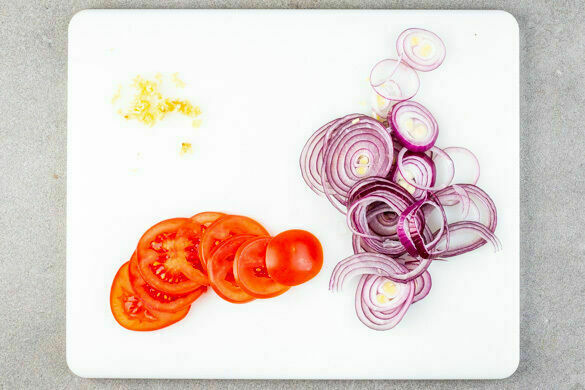 Den Backofen auf 200°C (180°C Umluft) vorheizen. Den Knoblauch schälen und durch eine Knoblauchpresse drücken oder sehr fein würfeln. Die Zwiebeln schälen und in dünne Ringe schneiden. Die Tomaten in dünne Scheiben schneiden.