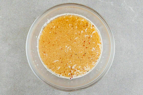 Den Couscous mit dem Knoblauch, 4EL Zitronensaft, 1TL Gewürzmischung, ½TL Salz und 1 kräftigen Prise Pfeffer in einer Schüssel vermengen. Das kochende Wasser über den Couscous gießen, umrühren und den Couscous abgedeckt 8–10Min. quellen lassen. Mit einer Gabel auflockern und abkühlen lassen.