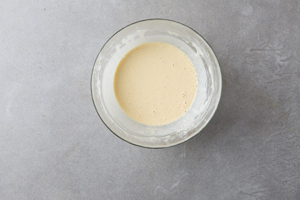 Die Eier mit 150–200ml Wasser und 1 Prise Salz verquirlen. Das Mehl zugeben und mit einem Schneebesen zu einem glatten Teig verrühren. Bis zur weiteren Verwendung ruhen lassen.