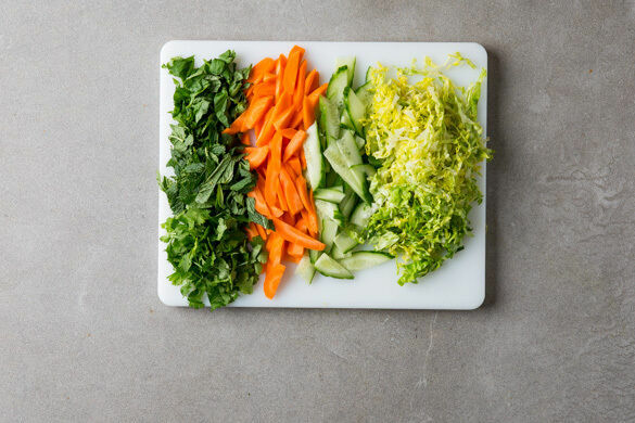 Die Gurke längs vierteln und schräg in dünne Scheiben schneiden. Die Karotten ggf. schälen, längs halbieren und ebenfalls in schräge Scheiben schneiden. Den Salat in feine Streifen schneiden, den Strunk entfernen. Die Blätter der Minze und des Korianders von den Stängeln zupfen und separat grob schneiden.