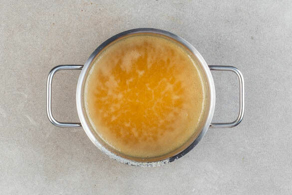 Den Topf und vom Herd nehmen und behutsam 2EL Butter und 60ml Milch einrühren. Vorsicht vor etwaigen Spritzern! Es ist nicht schlimm, wenn der Karamell ein wenig klumpt. Die Misopaste unterrühren, dann den Topf wieder auf den Herd stellen und alles bei schwacher Hitze glatt rühren. Den fertigen Miso-Karamell vom Herd nehmen.