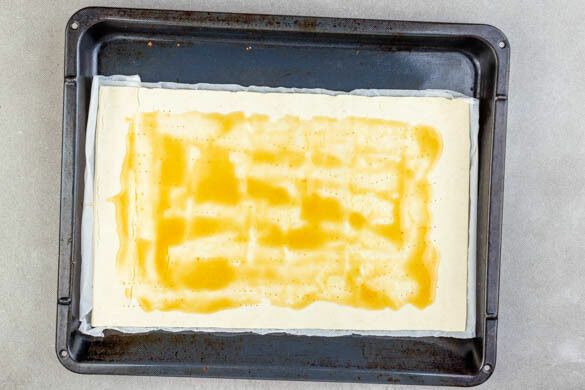 Den Teig mit dem Papier nach unten auf einem Backblech ausrollen und mit einer Gabel mehrmals einstechen. Eine dünne Schicht Karamell auf den Teig auftragen, an den Rändern ca. 3cm frei lassen.