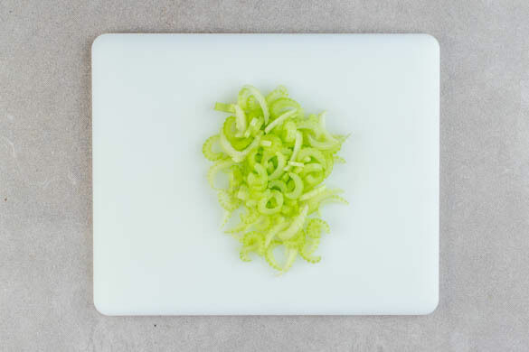 Den Backofen auf 220°C (200°C Umluft) vorheizen. Den Sellerie in dünne Scheiben schneiden.