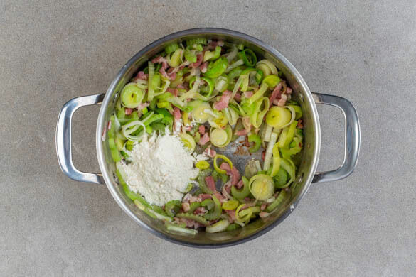 Den Speck in einem großen Topf mit 1EL Pflanzenöl bei mittlerer bis starker Hitze ca. 2Min. anbraten. Den Sellerie und den Lauch zufügen und ca. 2Min. mitbraten. 2EL Mehl darüberstäuben und das Gemüse und den Speck unter Rühren ca. 1Min. weiterbraten.