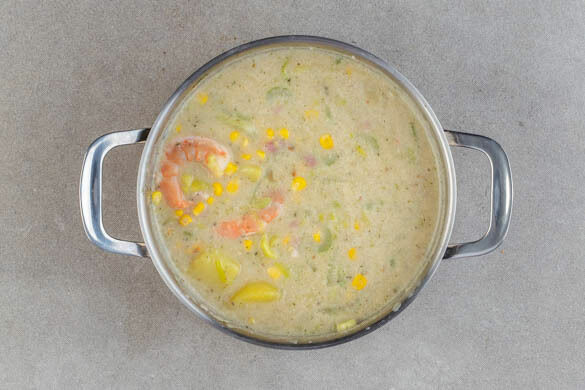 Die Garnelen in einem Sieb mit kaltem Wasser abspülen. Den Mais abgießen. Sobald die Kartoffeln weich sind, die Garnelen und den Mais zur Suppe geben und 2–3Min. mitkochen. Die Petersilie samt Stängeln grob schneiden.