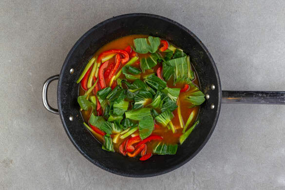 Die Paprika in der Fleischpfanne bei mittlerer bis starker Hitze ca. 3Min. braten, bis sie weich wird. Den weißen Pak Choi zugeben und ca. 2Min. mitbraten.