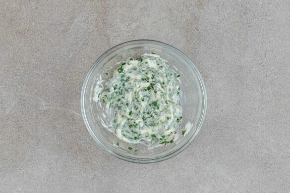 Den Backofen auf 220°C (200ºC Umluft) vorheizen. Den Schnittlauch in kleine Röllchen schneiden und mit 4EL Mayonnaise verrühren, mit je 1 Prise Salz und Pfeffer würzen.