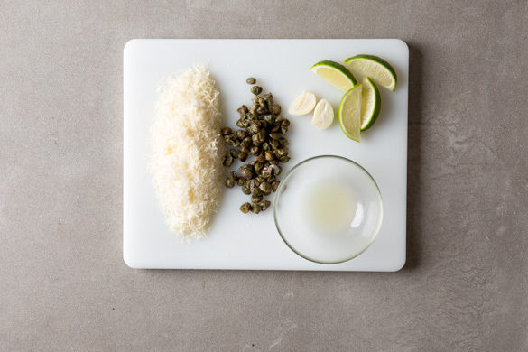 Inzwischen den Käse reiben und ca. ¼ für die Garnitur beiseitestellen. Die Kapern in einem Sieb unter fließendem Wasser gründlich abspülen und abtropfen lassen. Den Knoblauch schälen und halbieren. Die Limette halbieren, eine Hälfte auspressen, die andere Hälfte in Spalten schneiden.