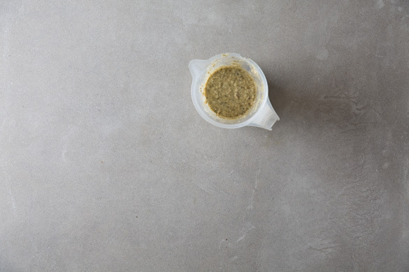 Den Knoblauch, 1–2TL Limettensaft, 1EL Senf, 2EL Olivenöl und Kapern nach Geschmack in einem hohen Gefäß mit einem Stabmixer möglichst fein pürieren. Den geriebenen Käse und 3–4EL Wasser hinzufügen und mit Pfeffer abschmecken. Tipp: Wer das Dressing flüssiger mag, kann noch etwas mehr Wasser hinzufügen.