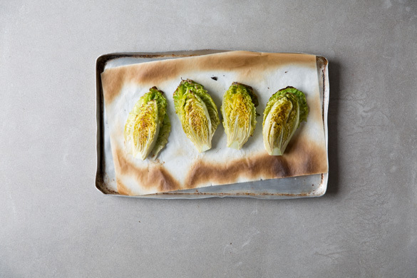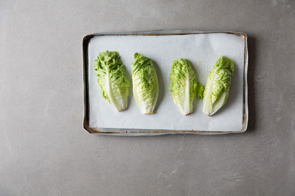 Den Romanasalat samt Strunk halbieren und von beiden Seiten mit insgesamt 2EL Olivenöl bestreichen. Die Kichererbsen vom Blech nehmen und den Salat mit der Schnittseite nach unten auf das mit Backpapier ausgelegte Backblech legen. Den Salat 2–3Min. im Ofen grillen bzw. backen, bis sich die oberen Blätter leicht verfärben.