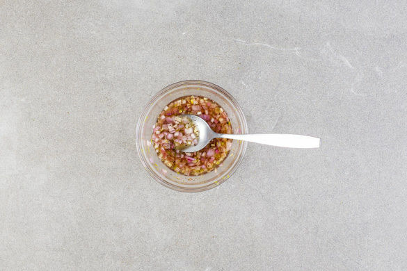 Die Limettenschale abreiben und die Limette halbieren, eine Hälfte auspressen, die andere Hälfte in Spalten schneiden. Die Schalotte schälen, halbieren und in möglichst feine Würfel schneiden. Mit ½TL Limettenschale, dem Limettensaft, 2EL Olivenöl, 1EL Essig sowie je 1 Prise Salz und Pfeffer zu einem Dressing verrühren.