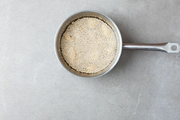 Den Backofen auf 220°C (200°C Umluft) vorheizen. In einem kleinen Topf 350ml leicht gesalzenes Wasser zum Kochen bringen. Die Quinoa in einem feinmaschigen Sieb mit warmem Wasser abspülen, in das kochende Wasser geben und 15–20Min. abgedeckt bei niedriger bis mittlerer Hitze sanft köcheln lassen. Vom Herd nehmen und abgedeckt warm halten.