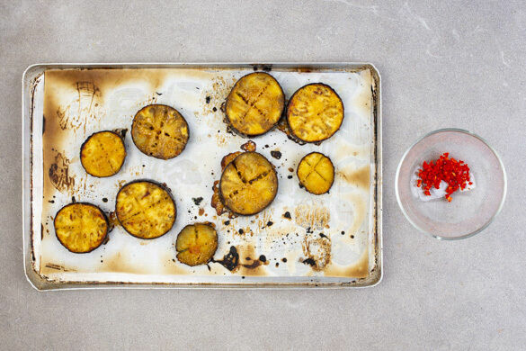 Den Backofen auf 200°C (180°C Umluft) vorheizen. In einem mittelgroßen Topf ausreichend gesalzenes Wasser für die Nudeln zum Kochen bringen. Die Aubergine in Scheiben schneiden, auf einem mit Backpapier ausgelegten Backblech verteilen, mit 1EL Pflanzenöl beträufeln und 1 Prise Salz darüberstreuen. Die Auberginen ca. 20Min. im Ofen goldbraun backen.
