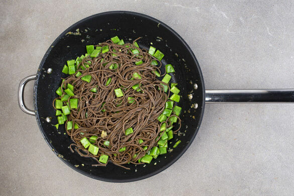 Asiatische Aromenpower ist heute Programm, wenn es eine würzige Sobanudelpfanne mit knackigen Kaiserschoten und dazu gebackene Auberginenscheiben gibt, die mit einer leckeren Miso-Ingwer-Sauce verfeinert werden. Zum Servieren wird alles nach Geschmack mit Sesam und Peperoni garniert. Lasst es euch schmecken!