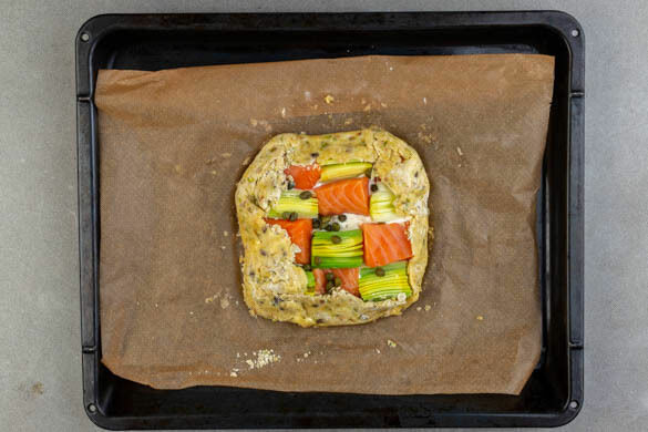 Den Teig mit dem Backpapier auf ein Backblech legen und mit der Fetacreme bestreichen, dabei ca. 4cm Rand frei lassen. Den Lauch, den Fisch und die ½ der Kapern auf der Creme verteilen und den Teigrand über die Füllung falten. Die Galette 25–30Min. im Ofen backen, bis sie leicht gebräunt ist.
