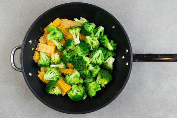Den Mais mit einem scharfen Messer vom Kolben schneiden. In einer mittelgroßen Pfanne 1EL Butter bei mittlerer Hitze schmelzen. Den Mais und den Brokkoli zugeben und 3–5Min. braten, bis das Gemüse leicht gebräunt ist. Das Gemüse aus der Pfanne nehmen und mit der Vinaigrette vermengen.
