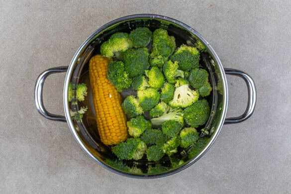 In einem mittleren Topf ausreichend gesalzenes Wasser für den Mais und den Brokkoli aufkochen. Die Maiskolben schälen, ggf. vorhandene Härchen entfernen. Den Brokkoli in mundgerechte Röschen schneiden. Den Mais bei mittlerer Hitze ca. 12Min. kochen, bis er gar und saftig ist. In den letzten ca. 2Min. den Brokkoli zugeben und mitkochen. Das Gemüse in ein Sieb abgießen.