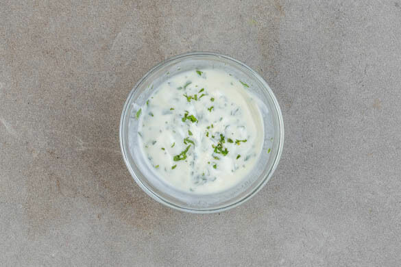 Die ½ der Minzeblätter oder mehr nach Geschmack abzupfen, fein schneiden und mit dem Joghurt und ½EL Essig verrühren. Mit Salz und Pfeffer abschmecken.