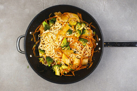 Den Brokkoli, den Knoblauch und die Karotten in einer großen Pfanne mit 1EL Pflanzenöl bei mittlerer bis starker Hitze 2–3Min. anbraten. Mit der Sojasauce ablöschen, dann das Kimchi samt Flüssigkeit unterrühren und alles bei mittlerer Hitze noch weitere 4–5Min. braten.