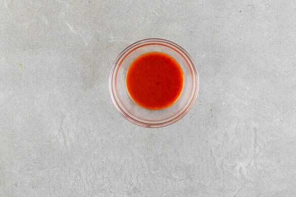 Die restliche Chilipaste mit 2EL Pflanzenöl, 2EL hellem Essig, 2TL Senf, 2TL Honig und 1 kräftigen Prise Salz zu einem Dressing verrühren. Tipp: Ggf. weniger Chilipaste verwenden, wenn Kinder mitessen.