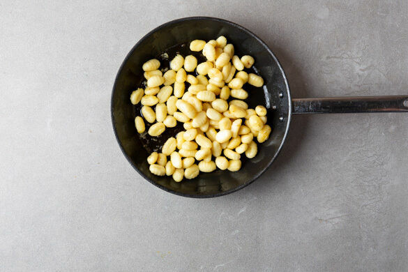 Die Gnocchi in einer großen Pfanne mit 2EL Pflanzenöl bei mittlerer Hitze in 5–7Min. goldbraun braten, dabei gelegentlich umrühren. Mit je 1 Prise Salz und Pfeffer würzen.