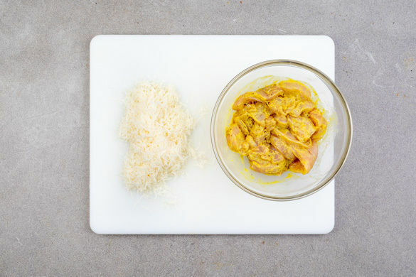 Das Fleisch trocken tupfen und mit 3EL Senf vermengen. Den Käse fein reiben.