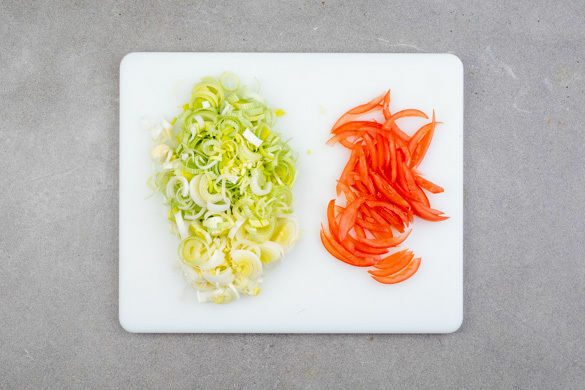 Den Lauch längs halbieren und quer in feine Streifen schneiden. Die Tomaten vierteln, nach Belieben vom Kerngehäuse befreien, und ebenfalls in feine Streifen schneiden.