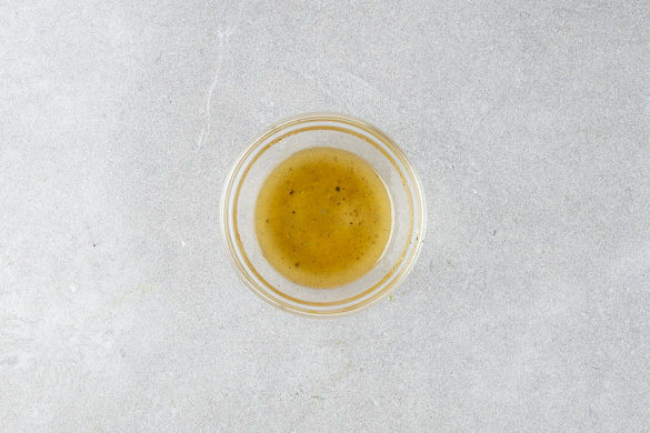 Das Sesamöl mit 1EL Pflanzenöl, 1EL Essig sowie Salz und Pfeffer nach Geschmack zu einem Dressing verrühren.