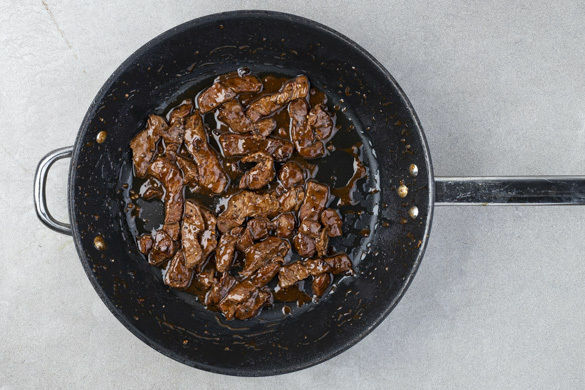 Das Fleisch aus der Marinade nehmen und in einer großen Pfanne bei mittlerer bis starker Hitze 2–3Min. scharf anbraten, bis das Fleisch leicht knusprig ist. Mit der Marinade ablöschen und weitere 1–2Min. braten.
