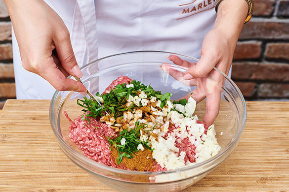 Die Petersilie samt Stängeln fein schneiden. Die ½ der Petersilie mit dem Hackfleisch, den restlichen Zwiebeln, dem Knoblauch, ca. 5 gehäuften EL Couscous, der Gewürzmischung sowie je 2 kräftigen Prisen Salz und Pfeffer verkneten. Aus der Masse ca. 18 Hackbällchen formen.